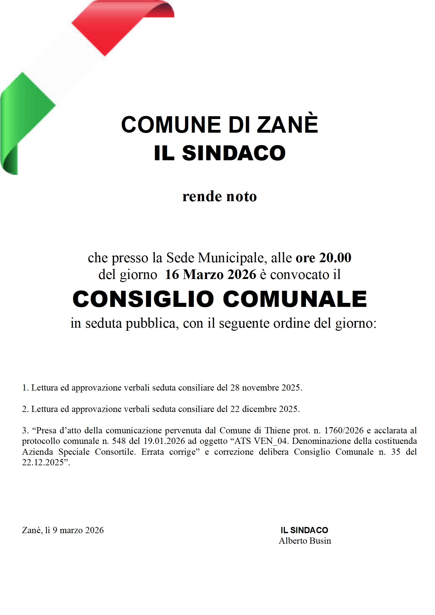 E' convocato il Consiglio Comunale il giorno lunedì 16 Marzo 2026 alle ore 20.00.